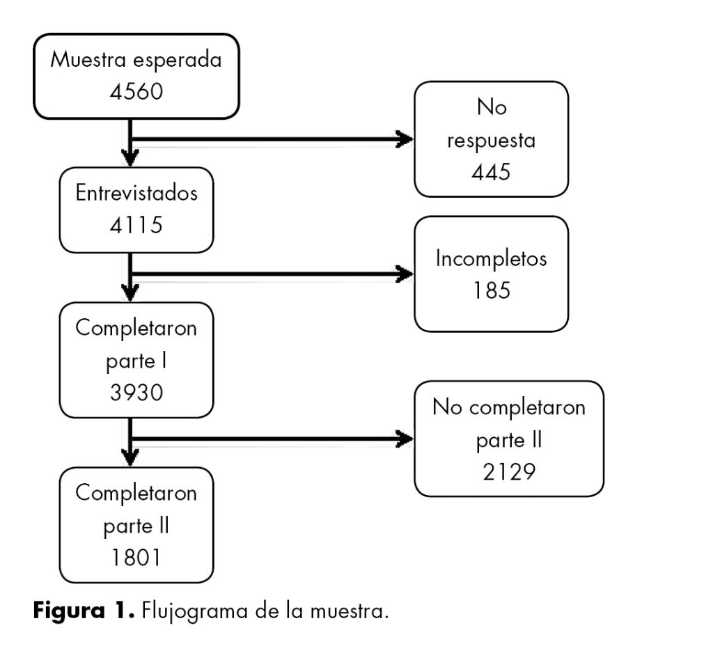 La población investigada fue definida como el conjunto de todas las viviendas particulares y sus residentes habituales de 18 a 65 años de edad de los ámbitos considerados para el estudio. Se excluyó a las personas residentes en instituciones públicas o privadas, cuarteles, reservaciones militares o de cualquier otro tipo de forma de vida que no sea familiar. El instrumento fue dividido en dos partes: 3930 personas contestaron sólo la parte I; de éstos, 1801 respondieron la parte I y la parte II del instrumento. El presente estudio incluyó a las 1801 personas que completaron ambas partes del instrumento (figura 1).