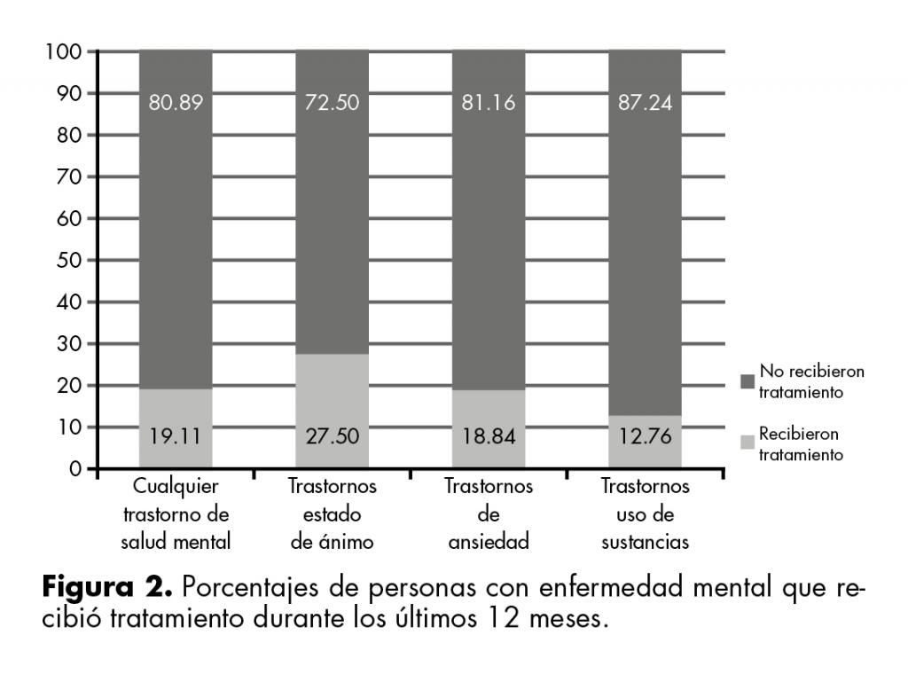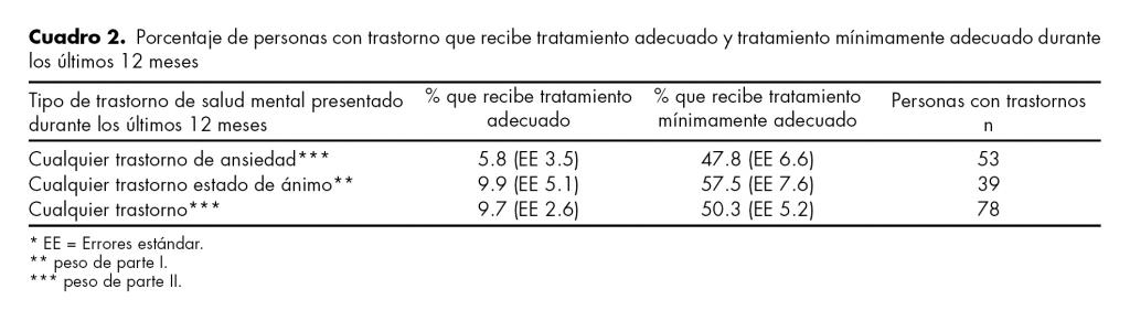 De acuerdo con esta definición, sólo 9.7% de las personas con cualquier trastorno durante los últimos 12 meses recibió tratamiento adecuado (cuadro 2). Esta proporción fue mayor para personas con cualquier trastorno del estado de ánimo.