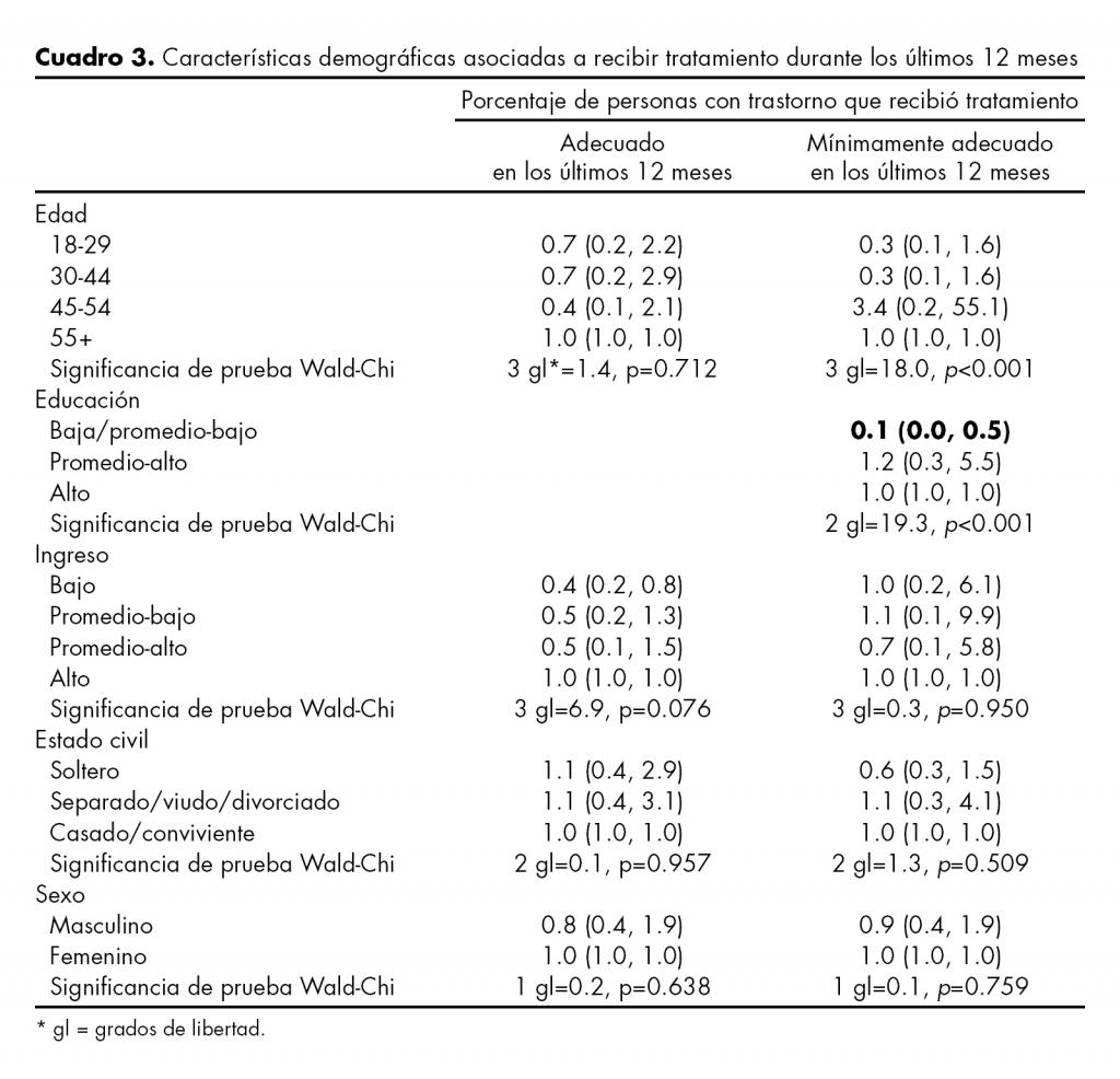 Las personas con bajo nivel de educación tuvieron menor acceso a Tratamiento Mínimamente Adecuado (OR=0.1; 95% CI=0.0, 0.5) en comparación con aquellos con un nivel alto de educación. No se encontró asociación entre el acceso a tratamiento durante los últimos 12 meses y otras características demográficas analizadas, como edad, ingreso, estado civil y sexo (cuadro 3).