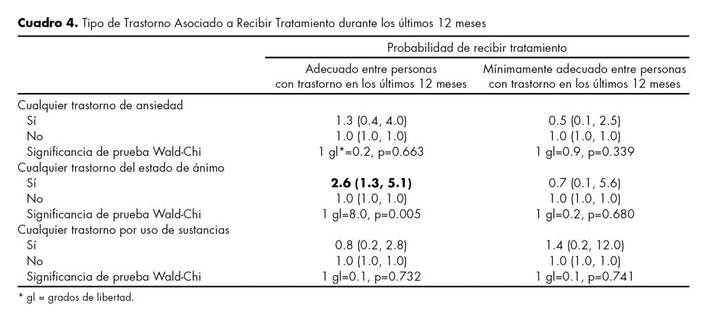Resultados. Sólo una de cada cinco personas que presentaron algún trastorno durante los últimos 12 meses recibió tratamiento durante ese período. En promedio, durante este tiempo recibieron tres atenciones. Sólo 9.7% de las personas con cualquier trastorno durante los últimos 12 meses recibió un tratamiento adecuado. Las personas con bajo nivel de educación tuvieron menor acceso a tratamiento mínimamente adecuado (OR=0.1; 95% CI=0.0, 0.5). El grupo con trastornos de uso de sustancias presentó menor acceso a tratamiento en los últimos 12 meses (12.7%).