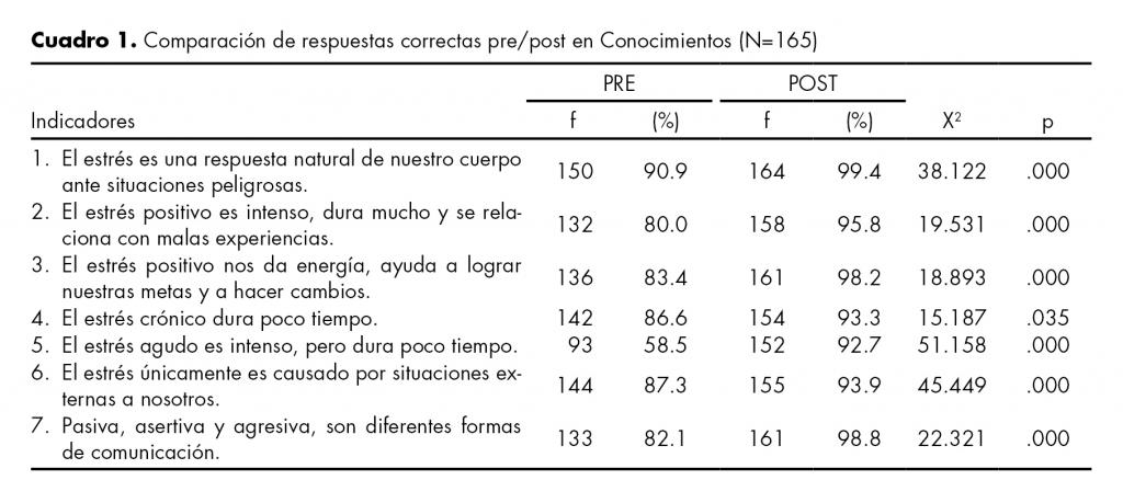Method. This intervention was tested using a chart designed to evaluate the knowledge, skills and attitudes components of stress management, consisting of 17 statements about Knowledge, 11 about Stress management; 20 about Attitudes for reacting to stress. A total of 165 professionals and interns from related careers participated. Statistical analyses were conducted to compare the scores of the three components before and after the intervention using the Student’s t test. McNemar’s test was used to compare the results.