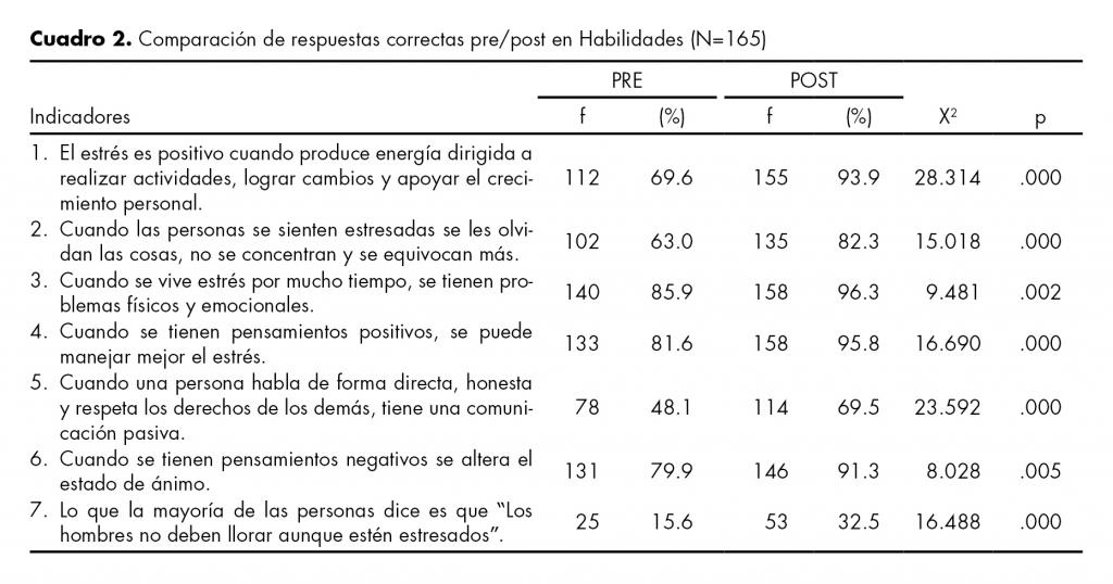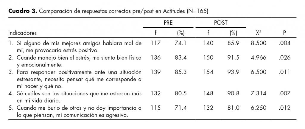 En los análisis de los indicadores se observó un incremento estadísticamente significativo en el número de respuestas correctas después de la intervención en cada uno de los componentes: siete de los 17 indicadores de Conocimientos que representan el 41.2% (cuadro 1), siete de los 11 de Habilidades, el 63.6% (cuadro 2), y cinco de los nueve de Actitudes, el 55.6% (cuadro 3). Tales indicadores, en cuanto a Conocimientos, se refirieron principalmente a los tipos de estrés y sus consecuencias físicas y emocionales. Con respecto a las Habilidades, a la comunicación asertiva, a las resignificaciones positivas de los pensamientos y a sus efectos sobre el estado físico y mental de las personas. En cuanto a las Actitudes: los indicadores se referían a la utilidad de las estrategias y herramientas para el manejo del estrés, como la respiración profunda, la imaginación guiada y a los tipos de comunicación adecuados para expresar los sentimientos.