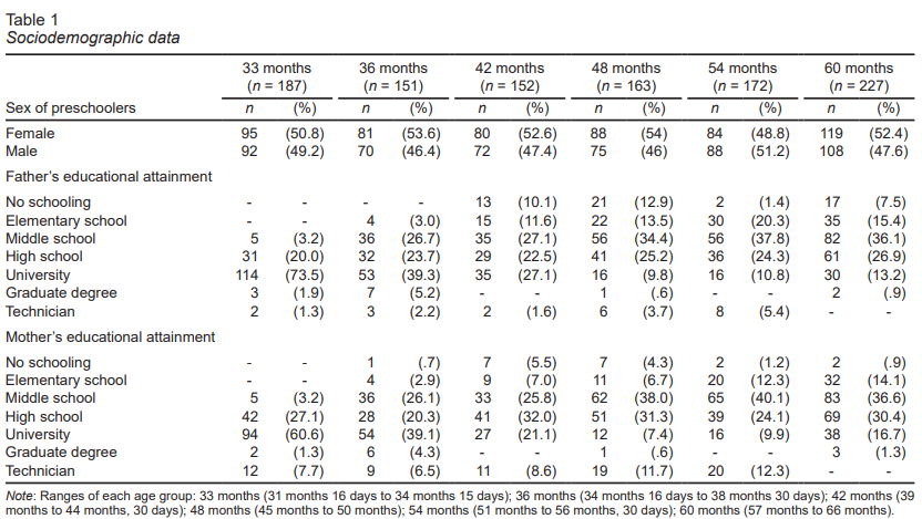 The sample comprised parents and guardians (n = 1291), out of which 194 parents declined to participate and 45 questionnaires were eliminated because they were not completely filled out, yielding a total of n = 1052 questionnaires, divided into six age groups (33, 36, 42, 48, 54, and 60 months of age) of the ASQ-3. Of the total sample, 48% (n = 505) were boys and 52% girls (n = 547). The parents’ educational attainment was extremely heterogeneous, a high percentage only completed middle school (Table 1).