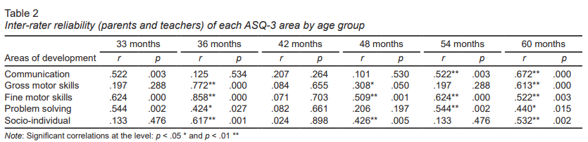 Results. A total of n = 1052 questionnaires were obtained, grouped into six age groups (33, 36, 42, 48, 54, and 60 months of age) according to the Ages and Stages Questionnaire-3 (ASQ-3). The levels of reliability of the ASQ-3 for each of the age groups were acceptable, with a range of α = .77 to α = .88. Regarding inter-rater reliability (parents vs. teachers), moderate correlation levels were observed.