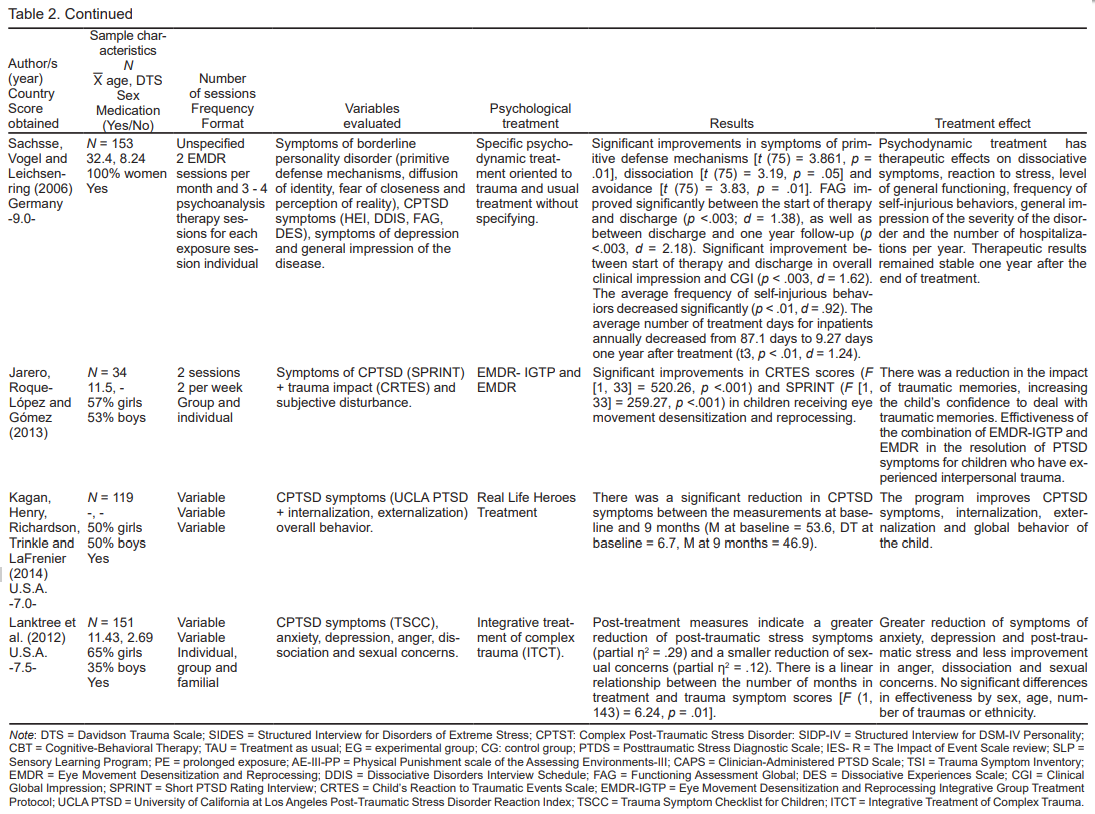 Lastly, the following information was extracted from each of the selected articles: authors, characteristics of the sample (sex, age, size), variables evaluated, and evaluation instruments used, name and features of the psychological treatment used, number, frequency and duration of sessions, format (individual or group), and duration of treatment and follow-up, statistical analysis of the data collected, and treatment effects (taking into account the variables evaluated and CPTSD symptoms).