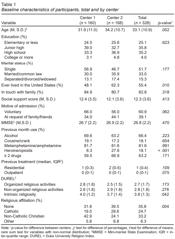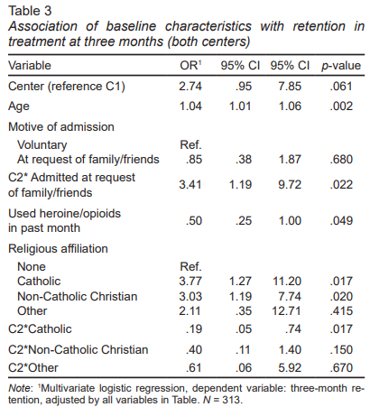 Method. We conducted an exploratory follow-up study of 328 clients admitted during 2014-2015 to either an Evangelical Pentecostal center or a faith-based center without a specific religious affiliation. The main outcome was retention, defined as remaining in treatment for at least three months.