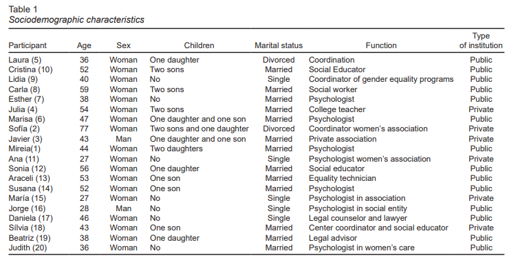 To achieve the objectives, a semi-structured interview was used; this involved a conversation between researcher/participant to understand, through the own words of the subjects interviewed, their perspectives on their experiences (Mendoza, 2006). This sample consisted of 20 female and male workers from the province of Barcelona-Spain who had worked or are currently working in actions related to the elimination of gender-based violence.