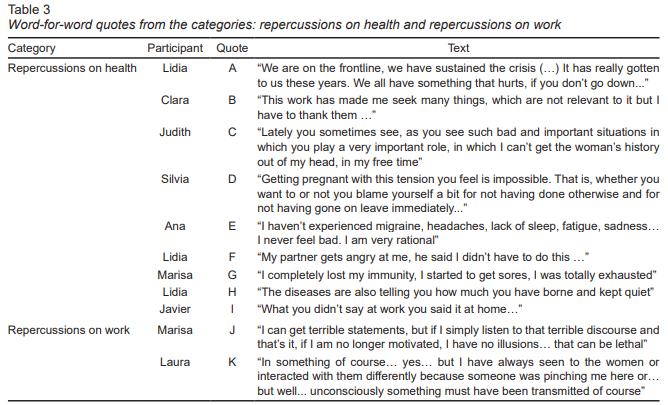Among the psychological repercussions found there are symptoms of anxiety and depression: negative thoughts, restlessness or insomnia and feelings of loneliness. They were expressed by the inability to disconnect from work “I am unable to get the woman’s history out of my head,” leaves due to depression and anxiety or constant worry ( Table 3 , quote C). The interviewees affirm that they are also victims of behavioral repercussions, which would have to do with problems with the family environment or with their friendships. The main consequences cited in this aspect are discussions in the couple “my partner gets angry at me...,” reduction of free time or discussions with friends and difficulties to set limits ( Table 3 , quotes F and I). In response to the question “What repercussions does work with violence have for you?,” used to investigate the consequences suffered, two of the participants affirmed that they had not suffered health consequences ( Table 3 , quote E). Their narratives also indicate that the repercussions were only positive aspects, such as personal growth, the search for resources “This work has made me look for many things ... I have to thank them,” strengthening or learning ( Table 3 , quote B).