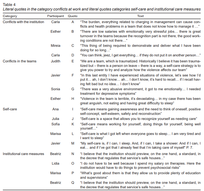 The participants expose some problems for the accomplishment of this self-care though. The main difficulties exposed are related to the condition of being a woman (refers to the burden of tasks and the assigned family care roles), the lack of time “self-care is what I have left when everyone goes to sleep...” and the lack of institutional response to the physical and psychological problems the workers report “I do not have to be well because I spend my salary on therapies” ( Table 4 , quotes L and O). The narrations of the interviewees indicate that there are deficits in the practice of this care.