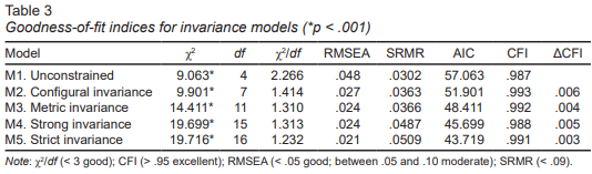 The next model ( Table 3 ) was the Metric Invariance Model (M3), considering the Strong Invariance Model (M4 - intercept values). The values of SRMR = .0366 and RMSEA = .024, in addition to the difference between the CFIs (CFIM3-M4 = .004) and AICs (AICM3-M4 = 2.712), allowed to accept the Metric Invariance model. The next step was to assess the equivalence between M2 and M4. The Strong Invariance Model showed an adequate fit ( Table 3 ) regarding its nesting with M2. The difference found between CFIs was .005; SRMR = .0487 and RMSEA = .024. Therefore, the Strong Invariance Model was accepted, thus concluding the equivalence with respect to the factorial coefficients and the intercept values.