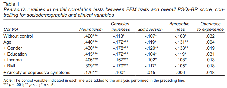 Sleep quality was correlated with low neuroticism (r[445] = .420, p < .001) and high conscientiousness (r[445] = -.181, p = .012), extraversion (r[445] = -.107, p = .024), and agreeableness (r[445] = -.108, p = .022), but showed no correlation with openness to experience (r[445] = .032, p = .500). Table 1 displays the results of partial correlation tests between PSQI-BR and personality traits, controlling for sociodemographic and clinical variables.