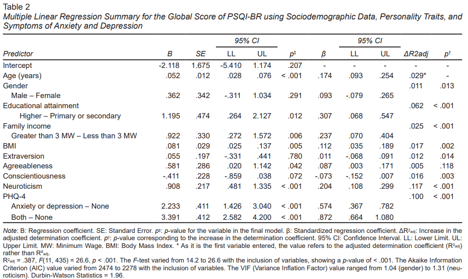 The final regression model showed a satisfactory fit, with an adjusted coefficient of determination (R2adj) of .387, indicating that it could explain 38.7% of the PSQI-BR score variance. Despite showing statistically significant associations at the bivariate level, the gender, conscientiousness, and extraversion variables were not found to predict sleep quality in the multiple linear regression model (Table 2).