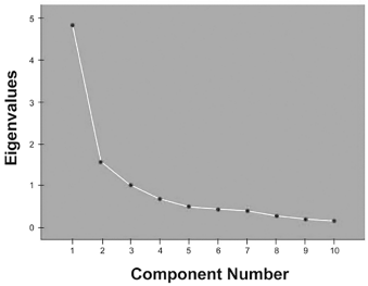 Regarding the validation and structure of the OCAL-TM, data from the screen plot and eigenvalues were used to determine the optimal number of factors. This analysis indicated that the most appropriate configuration for the scale consisted of two factors, as shown in Graph 1. During this process, item 5 was eliminated due to its reduced factor loading (< .40). The final scale therefore comprised 10 items (as shown in Table 2), showing that two factors accounted for 63.44% of the variance, and demonstrating high reliability with a Cronbach’s alpha coefficient of .874.