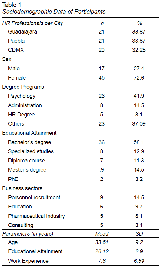 Sociodemographic data are given in Table 1 with percentages, means and standard deviation depending on the characteristics of each variable. A total of 62 interviews were conducted with HR professionals in companies in Guadalajara (n = 21), Puebla (n = 21), and CDMX (n = 20).
