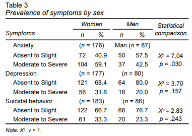 The chi-square test did not yield a significant association between symptoms and sex, although a greater presence of anxiety, depression and suicidal behavior was identified in women. For every ten women who completed their degrees, six presented symptoms of moderate to severe anxiety, as opposed to only four out of every ten men. In the case of moderate to severe depression, three out of ten women displayed these symptoms, while two out of ten men had depression. With respect to suicidal behavior, three out of ten women displayed this behavior as opposed to only two out of ten men.