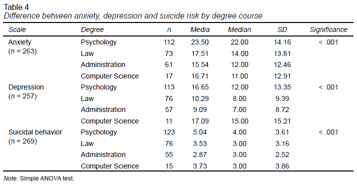 Results: An analysis of the data using SPSS v25 found that 53.0 % of students presented anxiety, 28.0 % depression and 30.1% suicidal behavior. Prevalence of the evaluated symptoms was higher in students who had completed more semesters, the presence of suicidal behavior differed by degree course, and women were more severely affected.