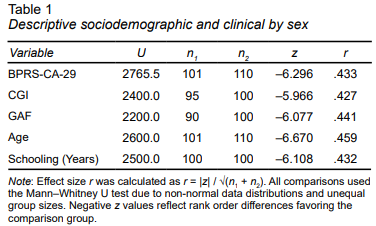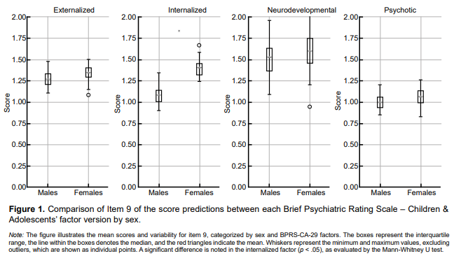 Cultural validation of the BPRS-CA for use in Mexican and other Spanish-speaking populations has been studied in adults (Sánchez et al., 2005). This instrument has also demonstrated strong inter-rater reliability (α = .85) and moderate test-retest reliability (r = .65) in adolescents, confirming its utility for longitudinal monitoring of changes in psychopathology. Moreover, the BPRS-CA framework aligns with modern psychiatric approaches that conceptualize symptoms along a continuum of factors rather than as discrete categories, facilitating the detection of subtle yet clinically significant shifts in symptom severity (de la Peña et al., 2005). However, while the tool is comprehensive, additional research on its specific application to SROs in adolescent clinical populations could enhance its diagnostic utility. For example, sex differences provide data on risk patterns. Research indicates that females have an increased risk of (attempt)-SROs compared to males (OR 1.96, 95% CI 1.54–2.50), though data specific to males in Mexican populations remain limited (Miranda-Mendizabal et al., 2019). This study could therefore contribute to understanding sex differences related to SROs status among Mexican adolescents.