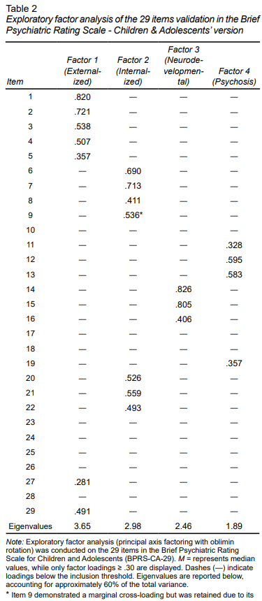The EFA found four factors in the BPRS-CA-29 scores for the total sample: externalized, internalized, neurodevelopmental, and psychotic symptomatic dimensions. The variance in the ninth item of the instrument was loaded into the internalized dimension. Table 2 shows the factor loading of the 29 items.