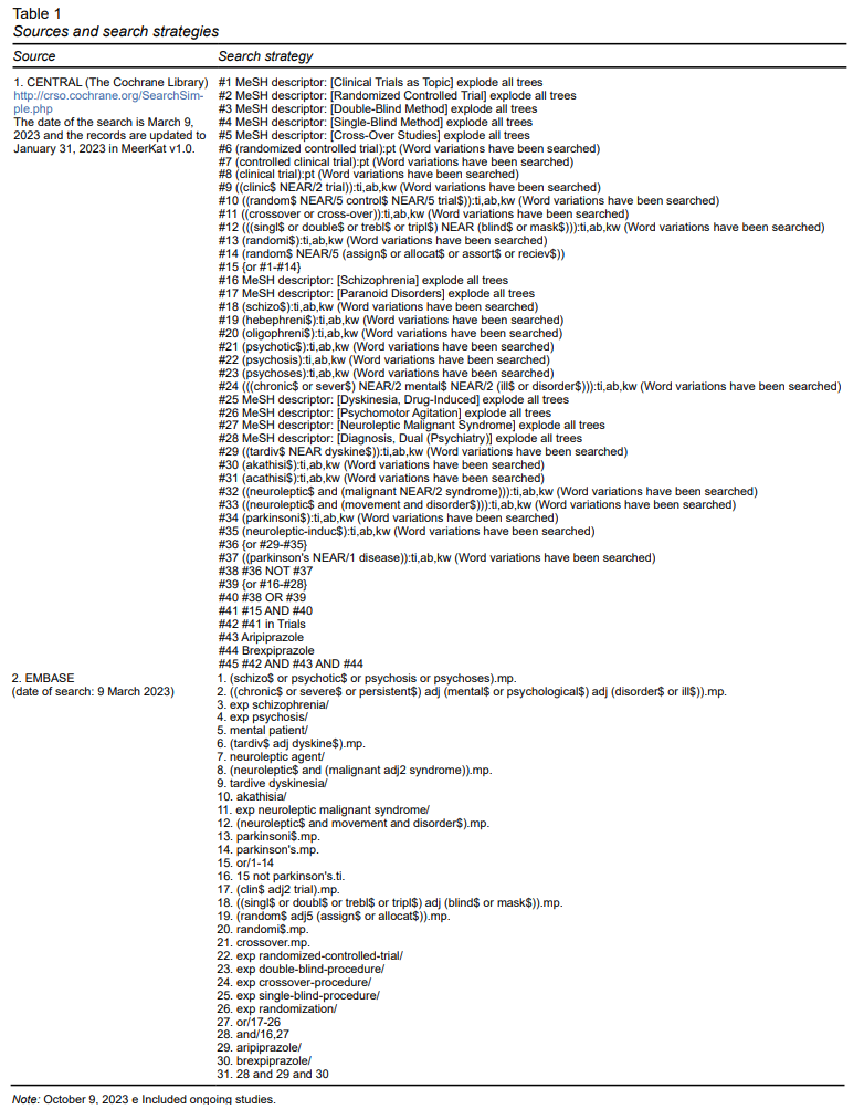 The search was conducted by the Cochrane schizophrenia group information specialist on March 9, 2023. The MEERKAT registry was searched in March 2023 using (*Aripiprazole* AND *Brexpiprazole*). Since few references were retrieved in this system, a search was performed in the EMBASE and Cochrane CENTRAL trial databases.