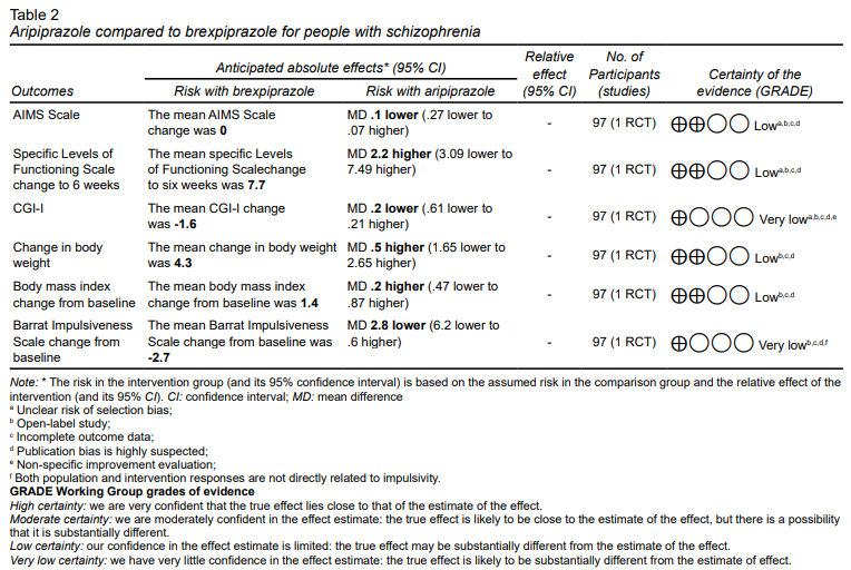 A small difference was observed in the Barrat impulsivity scale change, which could be marginally relevant, suggesting that brexpiprazole could be better for reducing impulsivity (MD -2.80, 95% IC -6.20, .60, low‐certainty evidence).