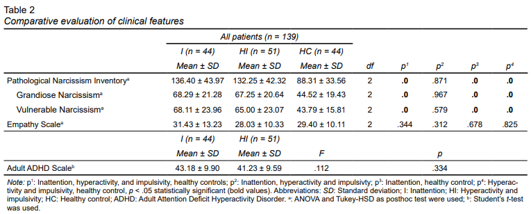 The evaluation of clinical features is shown in Table 2. There is a statistically significant difference between the three groups in the PNI scores (p = .001). PNI scores were significantly higher in both the inattention group (p = .001) and the hyperactivity and impulsivity group (p = .001) than in the healthy control group. In the pathological narcissism inventory, narcissistic grandiosity and narcissistic vulnerability subgroup scores were found to be significantly higher in the inattention, and hyperactivity and impulsivity groups than in the healthy control group (p = 0).