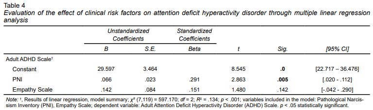 In Table 4, the effect of clinical risk factors on attention deficit hyperactivity disorder was evaluated by multiple linear regression analysis. The PNI scale and the Empathy scale were determined as the parameters to be evaluated in relation to ADHD in the model. A significant regression model was obtained (R2 = .134; χ2 (7.119) = 597.170; p < .001) and narcissistic features (β = .31, p < .05) were significantly associated with ADHD severity.