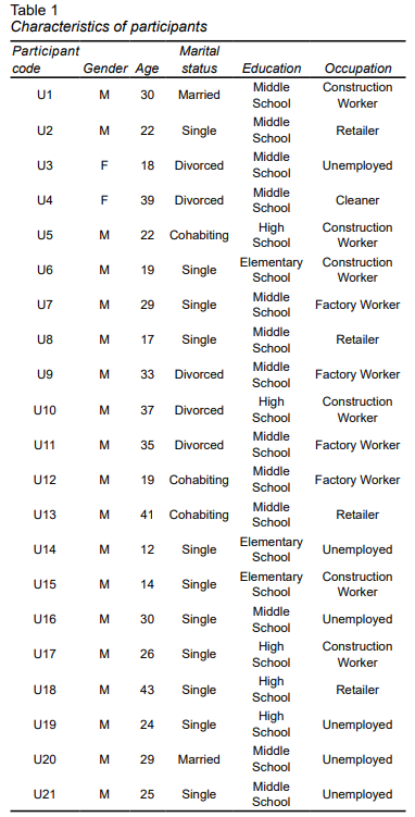 Study subjects were selected intentionally and homogeneously, following the guidelines of Smith and Osborn (2008), to represent diverse experiences related to crystal meth use. A total of twenty-one individuals (nineteen men and two women) undergoing residential treatment were interviewed. The inclusion criteria required participants to be over 18 years old, have crystal meth as their primary substance of abuse, and have provided informed consent. Comorbid health conditions related to substance use were not considered as exclusion criteria. The lower participation of women reflects their limited presence in these treatments, which are largely designed for men. Table 1 shows their main characteristics.