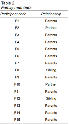 The fifteen family members interviewed were direct relatives (mothers, fathers, siblings, or partners) of those in treatment. Table 2 shows the relationship between users and their family members.