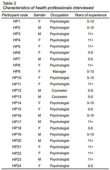Additionally, healthcare professionals, including psychologists and therapists from the Community Mental Health and Addiction Centers (CECOSAMA) in Aguascalientes, were chosen based on their experience treating crystal meth users, providing a comprehensive perspective. Table 3 shows their main characteristics.